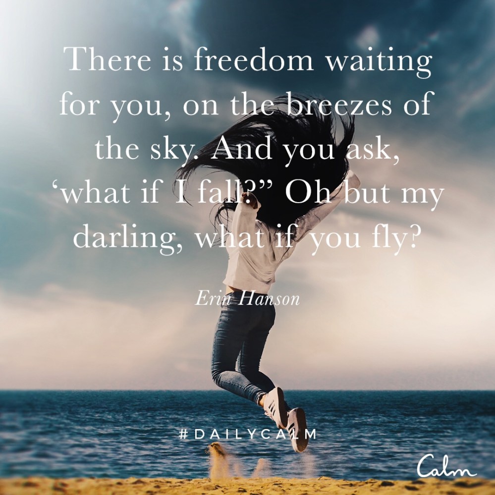 Today’s Daily Calm meditation topic was “fear of intimacy” — fear of opening up, and a habit of avoiding love. While I have less of that particular fear — hence, numerous heartbreaks and one granddaddy of a heartbreak a few years ago — my purpose for this post is that you can never remind yourself enough of how high you might fly.